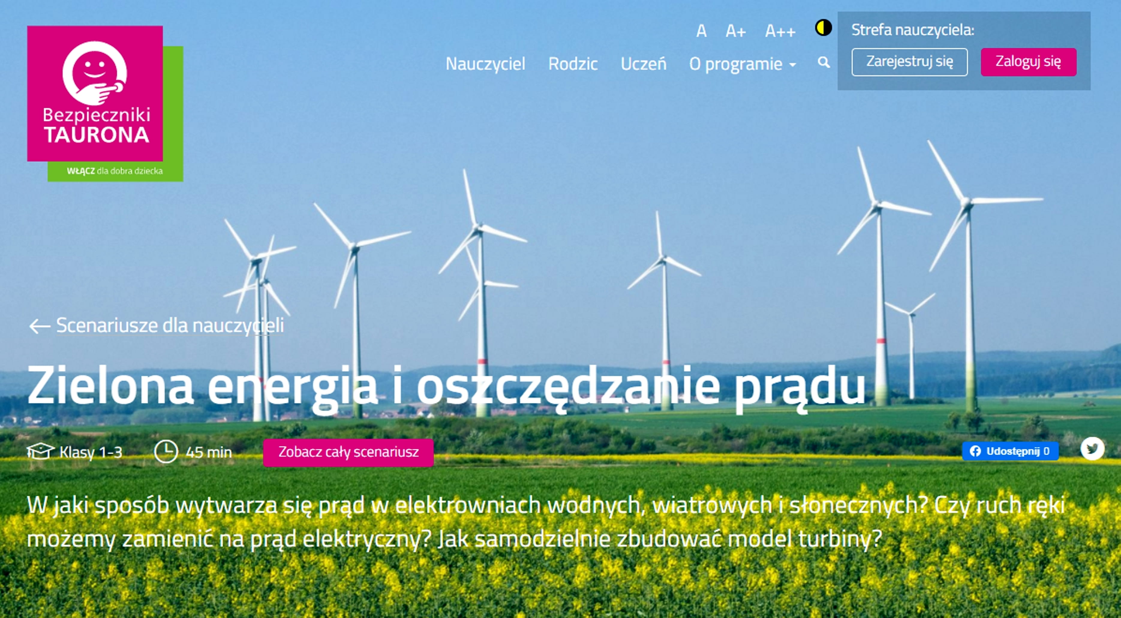 Wśród licznych scenariuszy lekcji na platformie „Bezpieczniki TAURONA” można znaleźć też takie poświęcone tematyce odnawialnych źródeł energii. W planie lekcji „Zielona energia i oszczędzanie prądu” znalazły się pomysły na proste doświadczenia. Dzieci dowiedzą się jak samemu wyprodukować prąd, jak działa dynamo i turbina w elektrowni. Co ważne, scenariusz jest zgodny z podstawami programowymi. Na potrzeby scenariusza powstał też kilkuminutowy film edukacyjny „Zielony prąd. Jak go wyprodukować i oszczędzać?”. Najmłodsi dowiedzą się z niego jak powstaje zielona energia i jakie są jej źródła. Film pokazuje też proces wytwarzania prądu w elektrowniach wiatrowych, wodnych oraz panelach fotowoltaicznych.