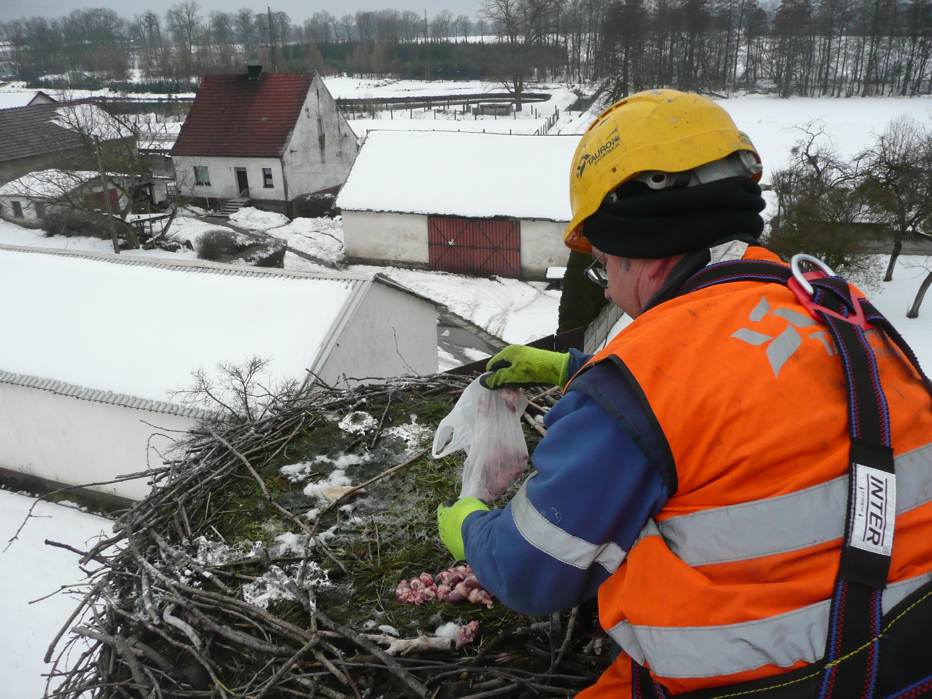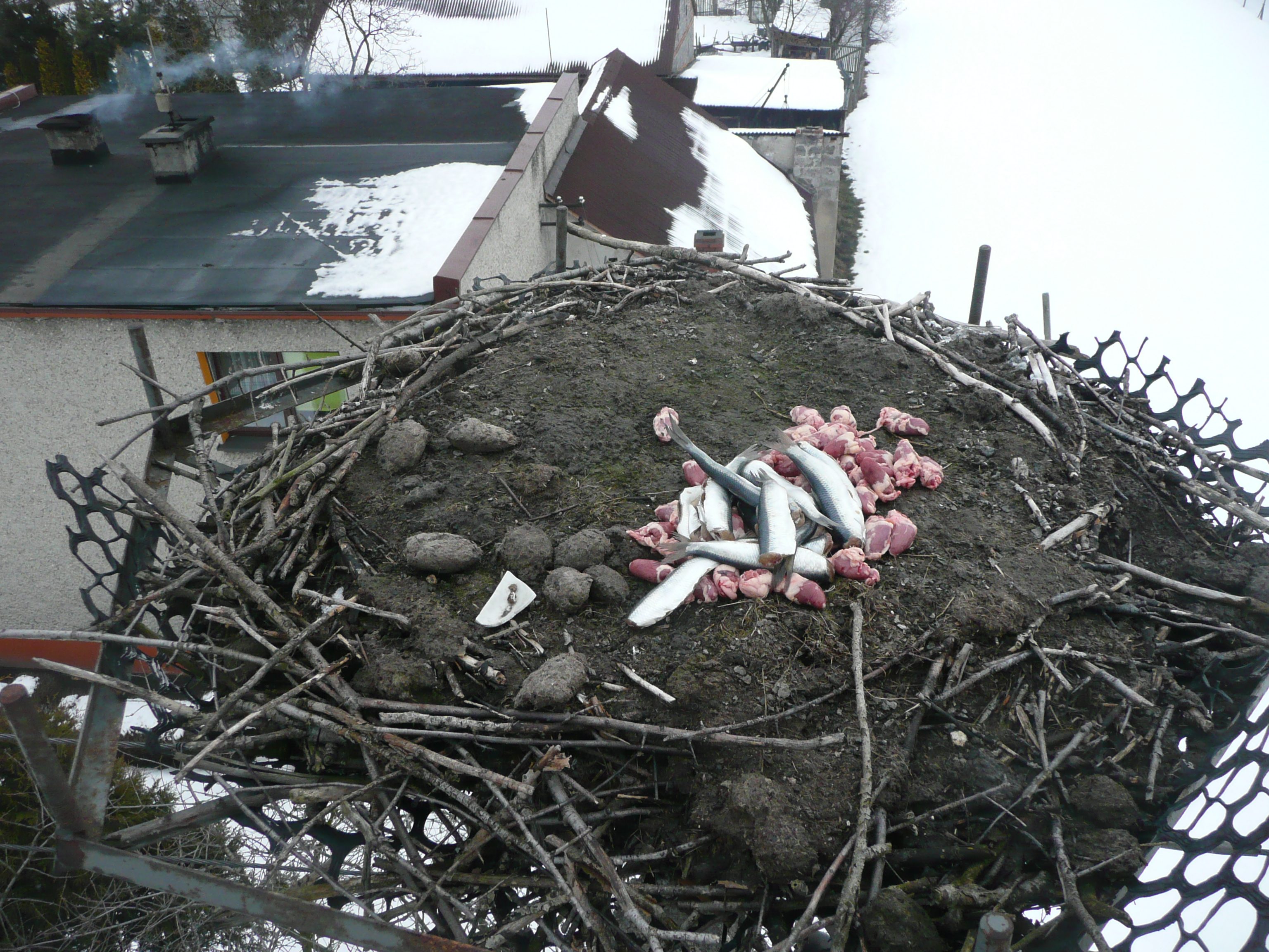 Gdy niesprzyjająca aura przedłuża się a na zewnątrz zalega grubsza warstwa śniegu lub lodu, warto rozważyć dokarmienie ptaków. Dobrym wyborem będą słodkowodne ryby o długości 10-15 cm, serca drobiowe lub pokrojone wołowe, czy tłuczone skrzydełka kurze. Pokarm zostaw w pobliżu bociana jednak miejscach bezpiecznych, łatwych do obserwacji i trudno dostępnych dla np. kotów, psów, lisów. Nie karm ptaków resztkami ze stołu, w tym wędlinami, produktami zbożowymi, słodyczami oraz rybami morskimi czy gryzoniami, które zginęły od trutki.